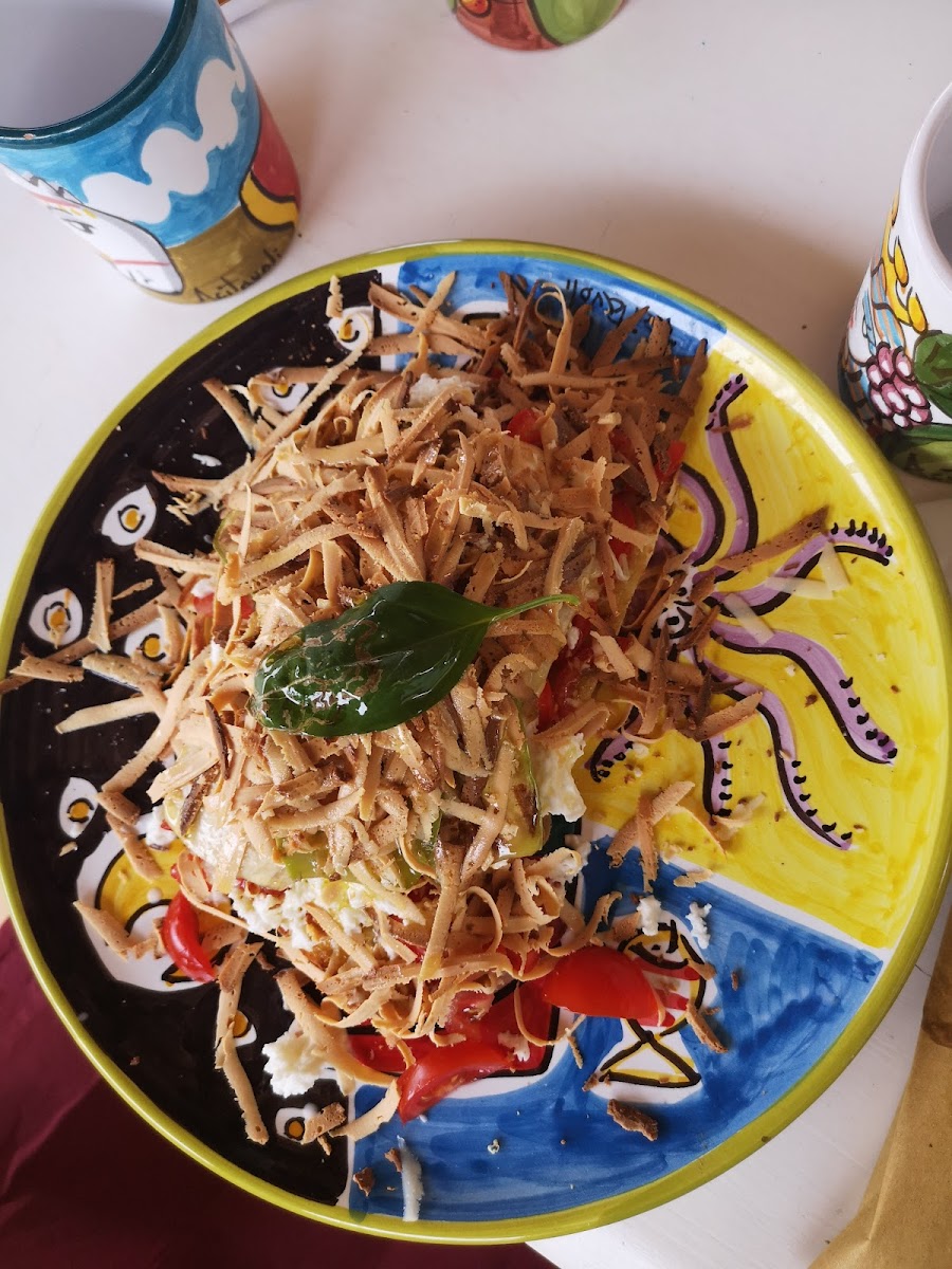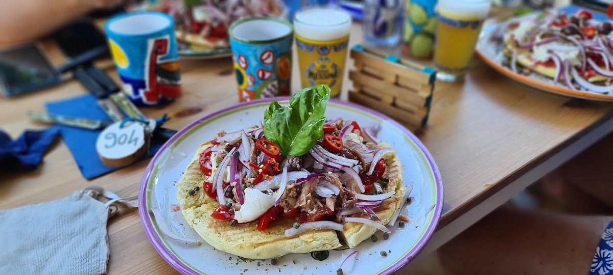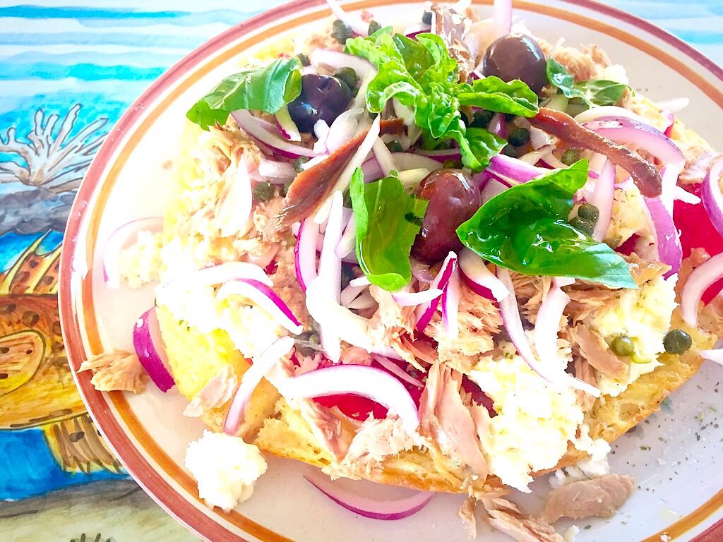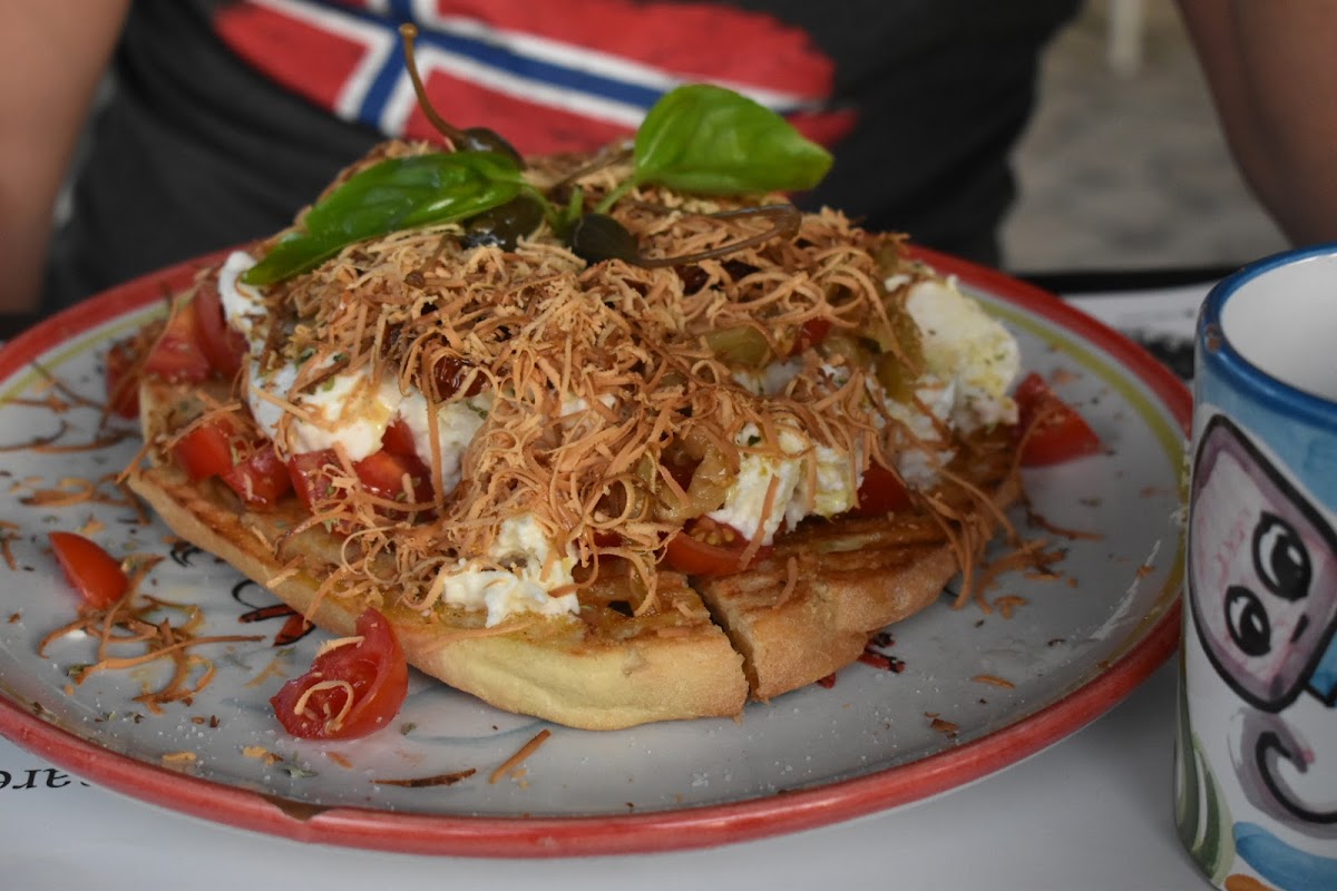 Pane cunzatu is like a huge salad on toasted crust. Perfect to reload batteries after a hike on the nearby volcano. The location is a 10 min walk from the harbour but totally worth it. Very cozy and friendly.